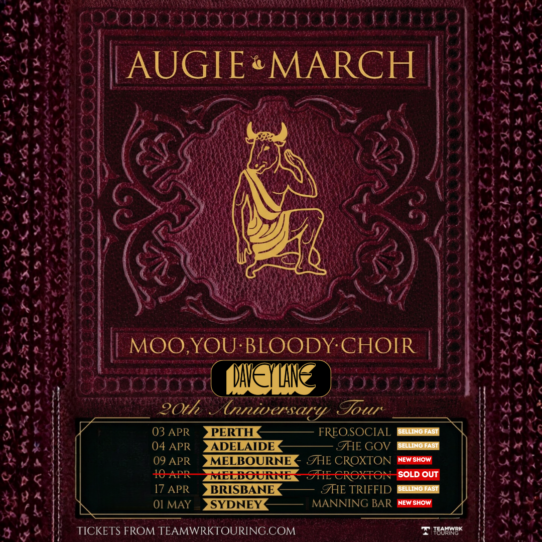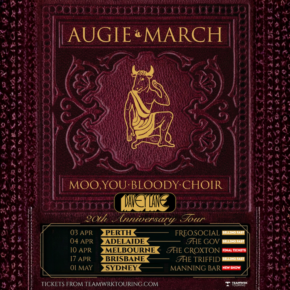 Announcing that Augie March will be performing live in Sydney as part of the Moo, You Bloody Choir 20th Anniversary Tour, presented under the Great Southern Nights festival. We're playing the Manning Bar on May 1, 2026.