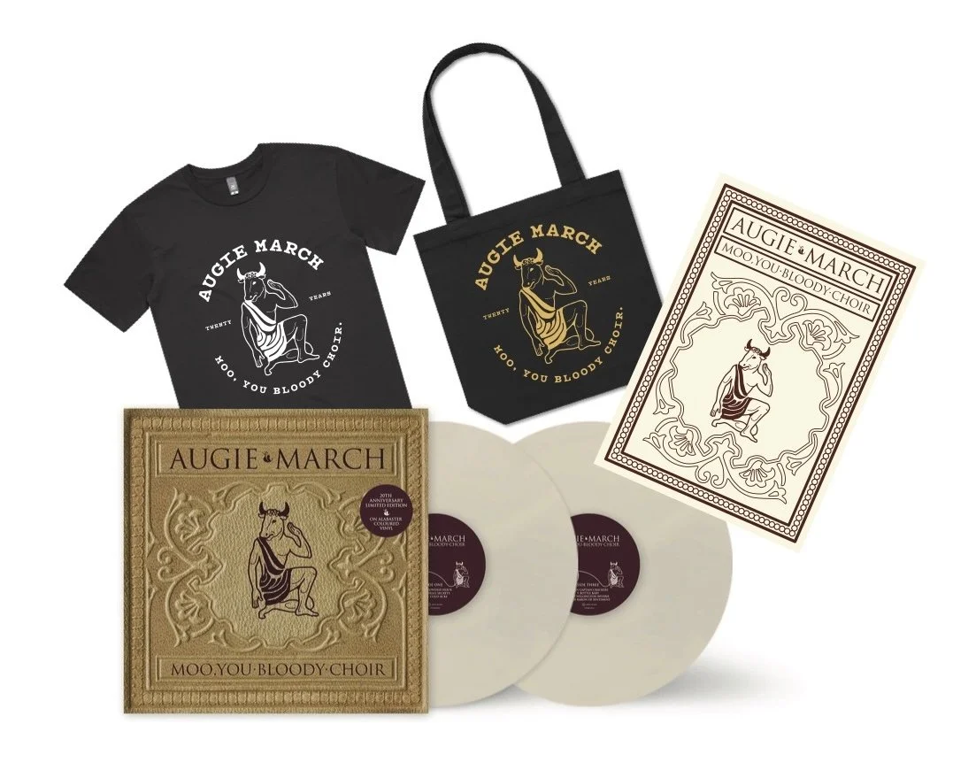 This bundle includes the limited edition 2LP on alabaster vinyl with an exclusive gold and maroon cover — hand-signed by Augie March — plus a t-shirt (your choice of Burgundy or Black Minotaur tee), tote bag and a tea towel.